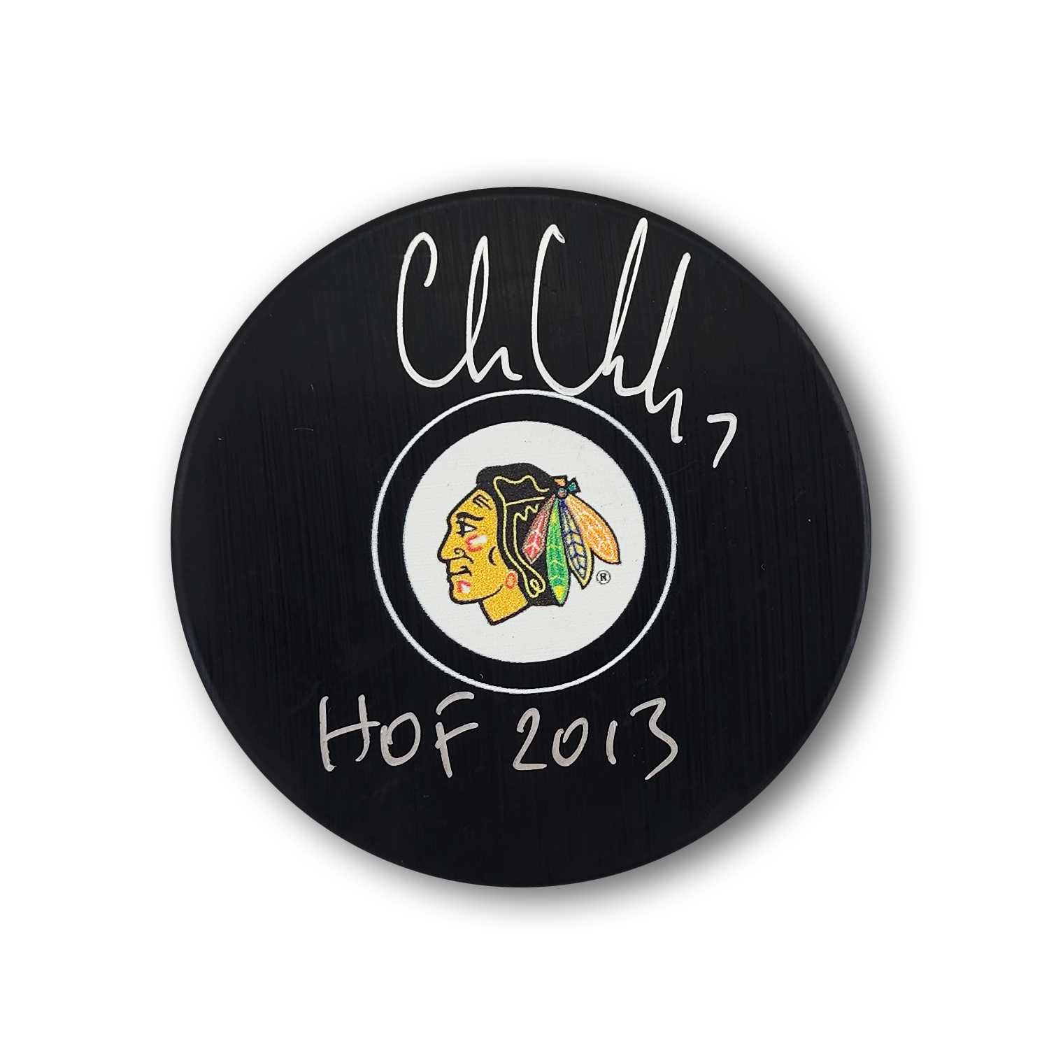 This Chicago Black Hawks Hockey Puck has been autographed by Chris Chelios