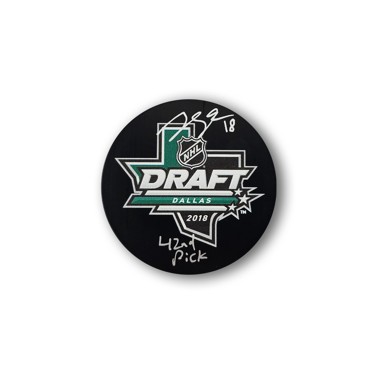 This 2018 NHL Draft Day Hockey Puck has been autographed and Inscribed by Jake Drury