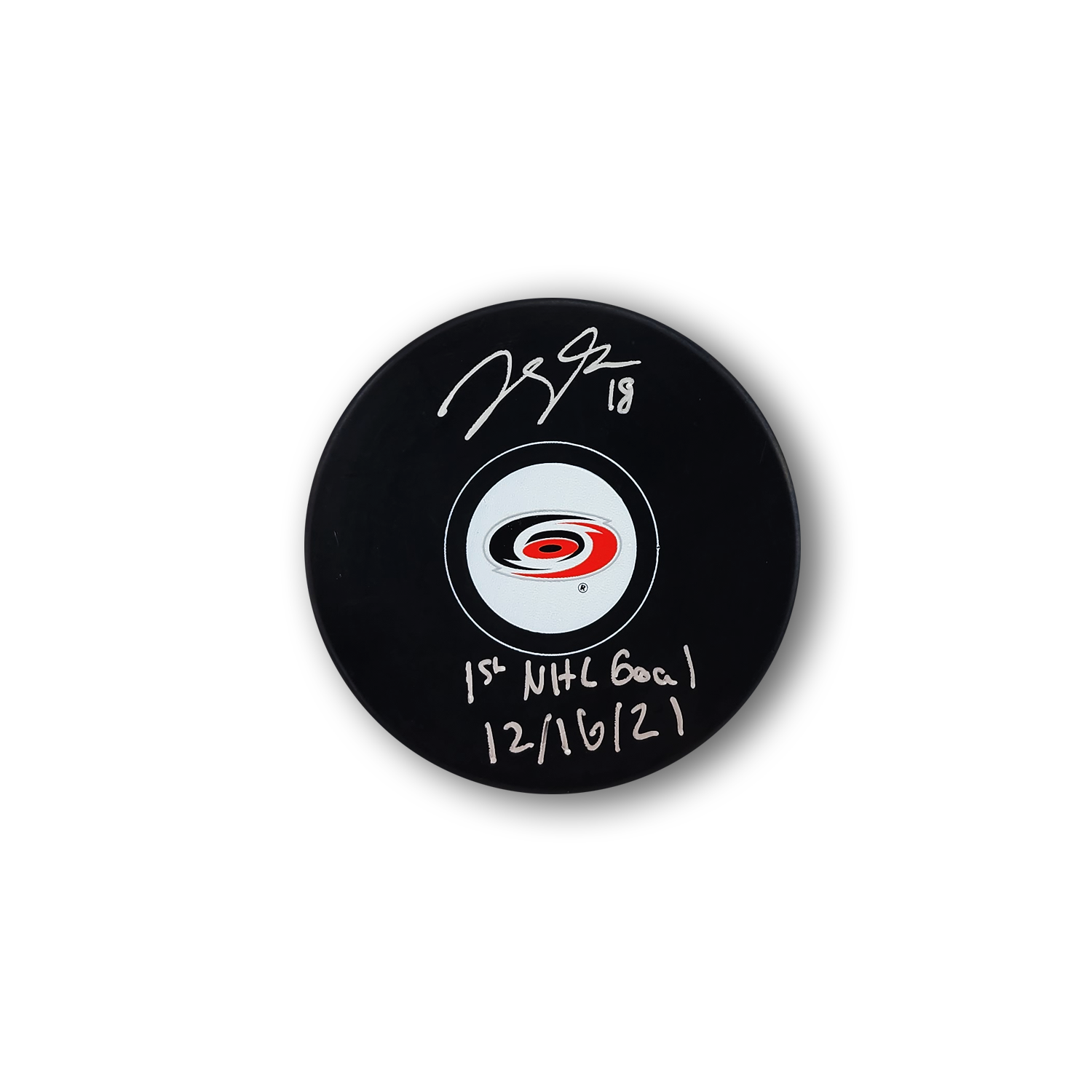 This Carolina Hurricanes Puck has been autographed by Jake Drury