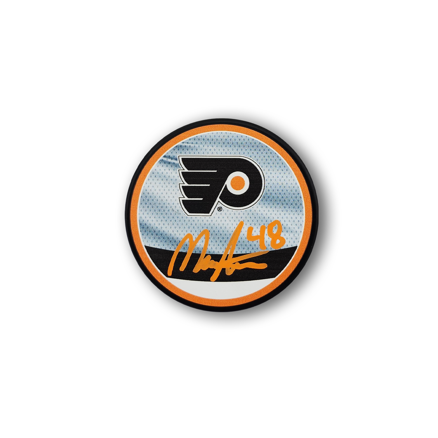 This Philadelphia Flyers Hockey Puck has been autographed by Morgan Frost