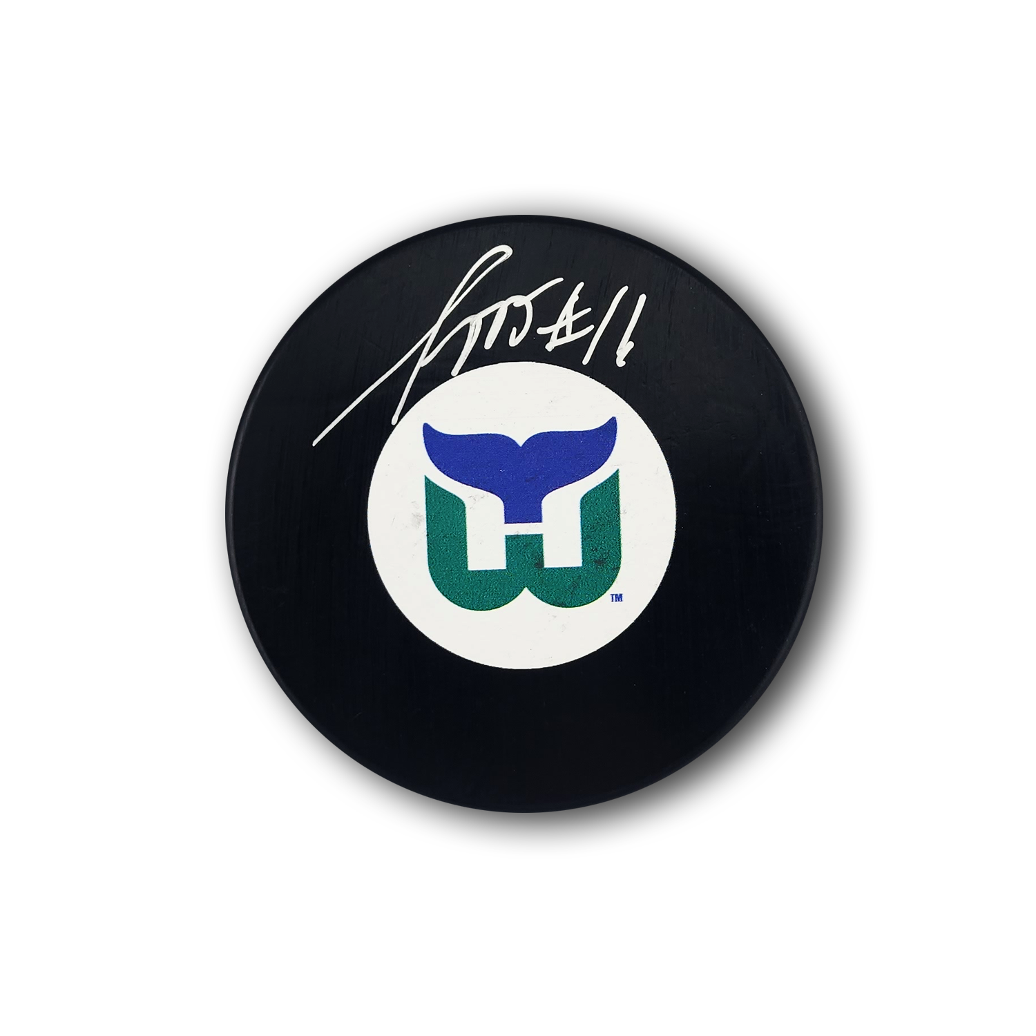 This Hartford Whalers Hockey Puck has been autographed by Sylvain Turgeon